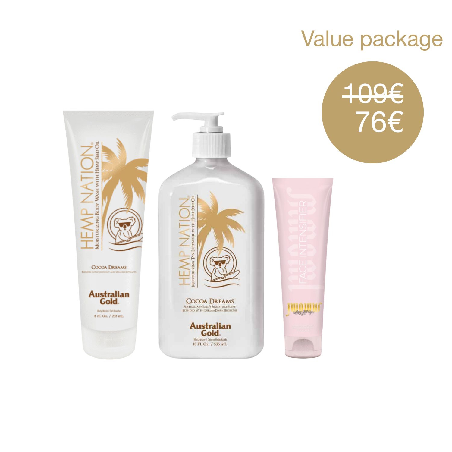 Australian Gold komplekt sisaldab tooteid, mis pakuvad nahale luksuslikku hooldust ja intensiivset niisutust. Hemp Nation Cocoa Dreams kehapesugeel koos kookose ja apelsiniga niisutab ning kaitseb nahka, samas kui Australian Gold Hemp Nation Cocoa Dreams Tan Extender pikendab päevitust ja toidab nahka. Jwoww Face Intensifier päevituse kiirendaja näole aitab saavutada kauakestva päevituse. Vivid Intensifying ja Sleek Moisture Technology pakub nahale täiendavat niisutust ja pehmust.