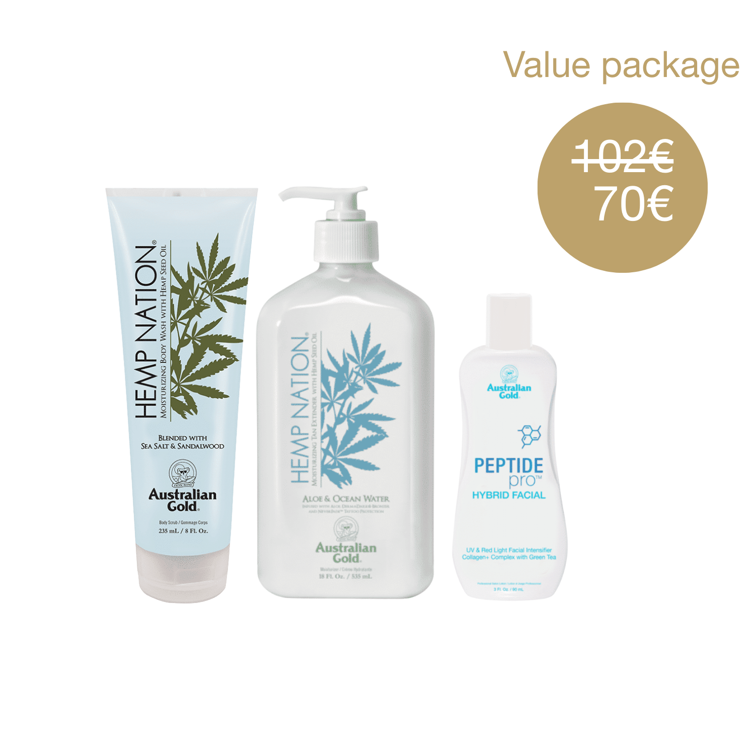 Värskendav komplekt sisaldab Australian Gold Hemp Nation Sea Salt & Sandalwood kehapesugeeli, mis niisutab ja puhastab nahka. Meresool ja sandlipuu segu jätab naha pehmeks ja niisutatuks. Australian Gold Hemp Nation Aloe & Ocean Water Tan Extender toidab nahka aaloe ja ookeaniveega, aidates säilitada niiskust ja pikendada päevitust. Australian Gold Peptide Pro Hybrid Facial pakub sügavat niisutust kollageeni peptiidide ja rohelise tee abil, aidates nahka noorendada, siluda ja toniseerida.